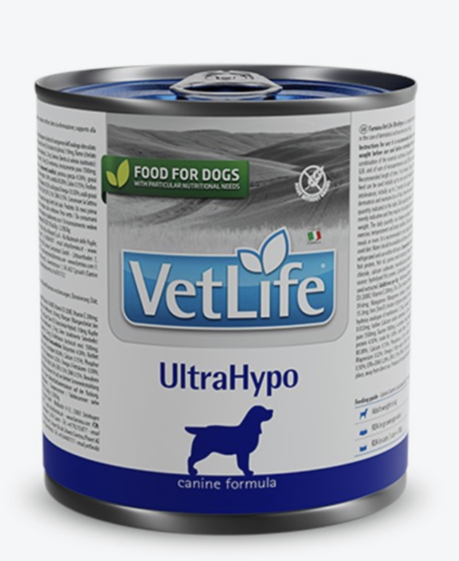 Farmina Vet Life UltraHypo è un alimento dietetico completo per cani per la riduzione di intolleranze a ingredienti e sostanze nutritive; dieta di eliminazione; supporto della funzionalità cutanea in caso di dermatosi ed eccessiva caduta dei peli.